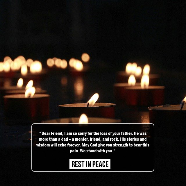 “Dear Friend, I am so sorry for the loss of your father. He was more than a dad – a mentor, friend, and rock. His stories and wisdom will echo forever. May God give you strength to bear this pain. We stand with you.”