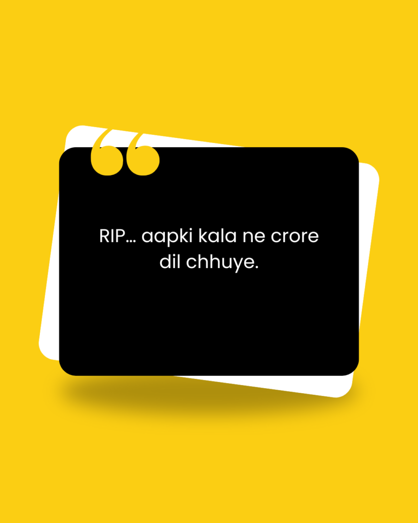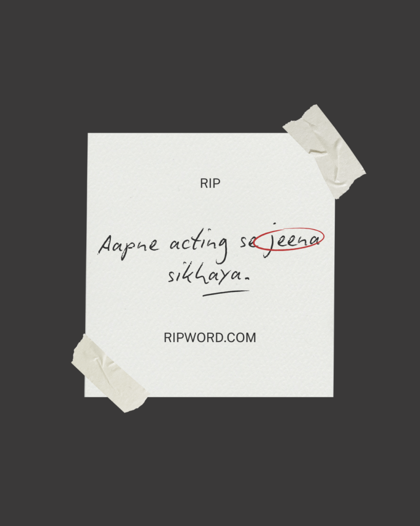 RIP quotes help fans say goodbye with love—social media par share karne ho, tribute dena ho, ya kisi special moment mein unki yaad karni ho. Neeche diye gaye RIP quotes actor ki kala, unki journey aur unki yaadon ko hamesha zinda rakhne mein madad karega. Unki art amar hai, aur unki yaad humesha dil mein rahegi. RIP.